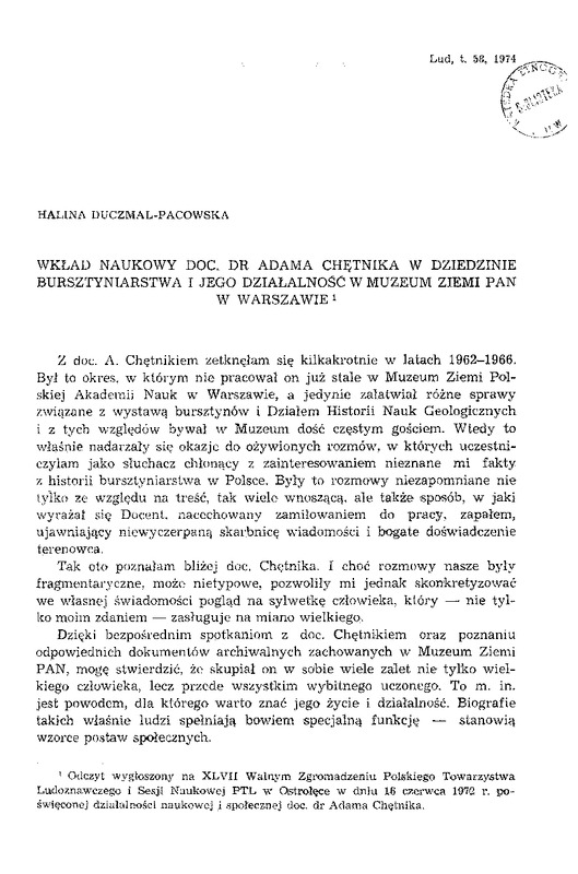 Wkład naukowy doc.dr Adama Chętnika w dziedzinie bursztyniarstwa i jego działalność w Muzeum Ziemii PAN w Warszawie / LUD 1974 t.58