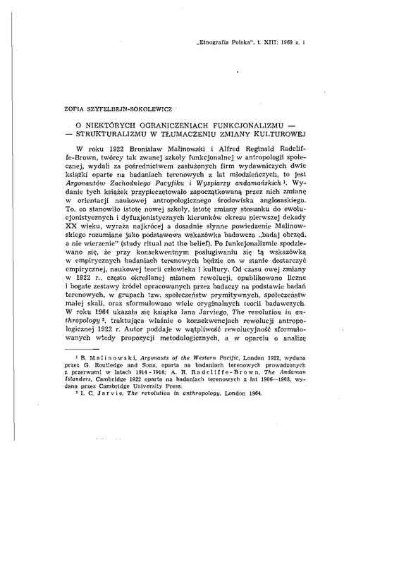 O niektórych ograniczeniach funkcjonalizmu-strukturalizmu w tłumaczeniu zmiany kulturowej / ETNOGRAFIA POLSKA 1969 t.13 z.1