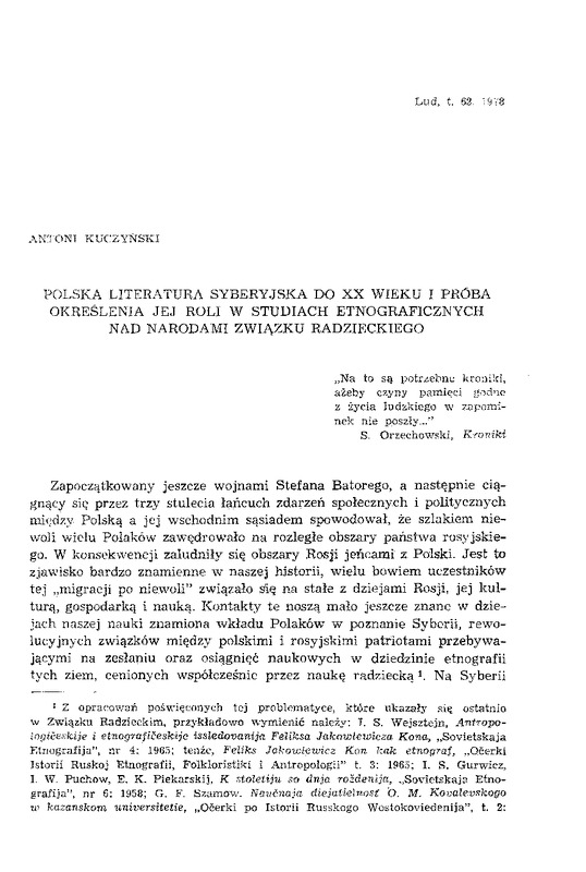 Polska literatura syberyjska do XX w. i próba określenia jej roli w studiach etnograficznych nad narodami Związku Radzieckiego / LUD 1978 t.62