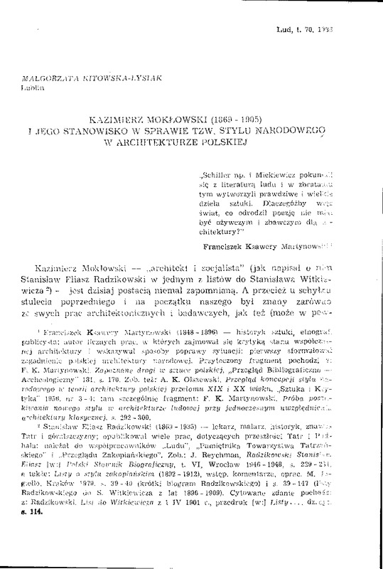 Kazimierz Mokłowski (1869-1905) i jego stanowisko w sprawie tzw.stylu narodowego w architekturze polskiej / LUD 1986 t.70