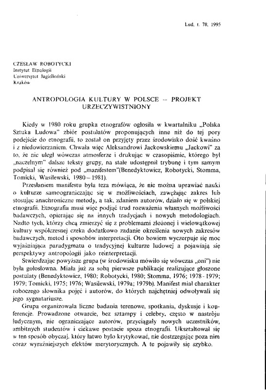 Antropologia kultury w Polsce - projekt urzeczywistniony / LUD 1995 t.78