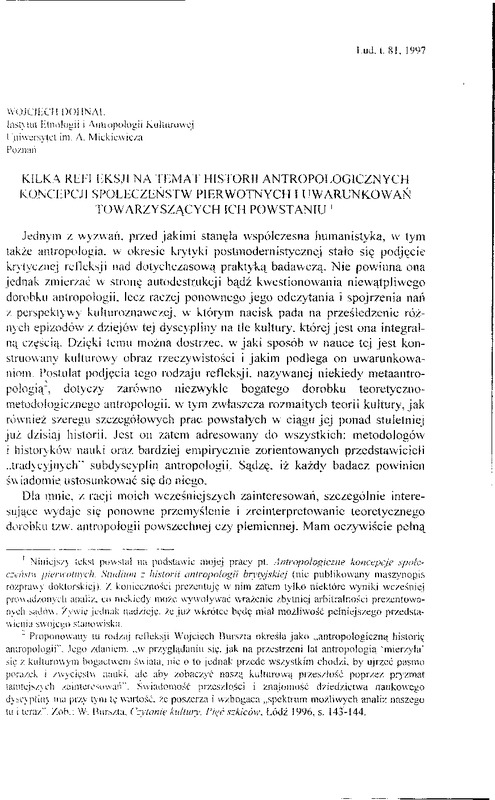 Kilka refleksji na temat historii antropologicznych koncepcji społeczeństw pierwotnych i uwarunkowań towarzyszących ich powstaniu / LUD 1997 t.81