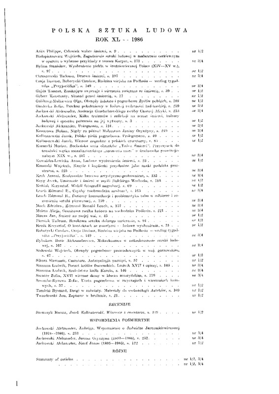 - Spis treści rocznika XL 1986; Od redakcji; Contents / Polska Sztuka Ludowa - Konteksty 1987 t.41 z.1-4