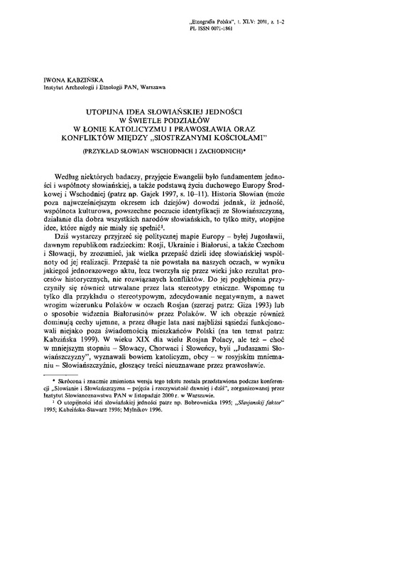 Utopijna idea słowiańskiej jedności w świetle podziałów w łonie katolicyzmu i prawosławia oraz konfliktów między "siostrzanymi Kosciołami" / ETNOGRAFIA POLSKA 2001 t.45