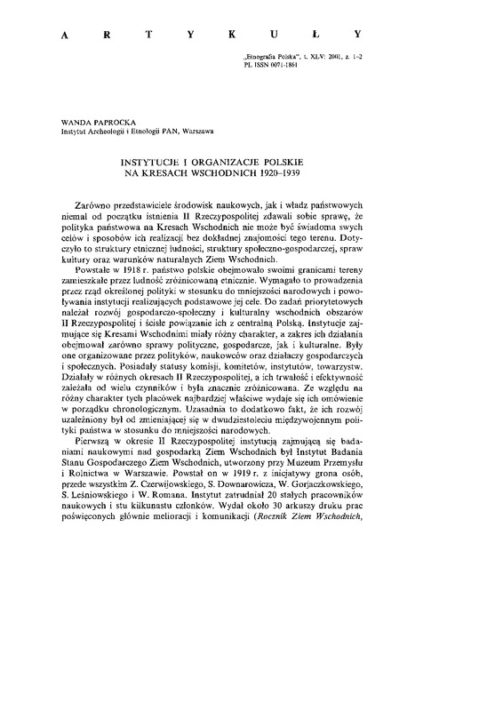 Instytucje i organizacje polskie na Kresach Wschodnich 1920-1939 / ETNOGRAFIA POLSKA 2001 t.45