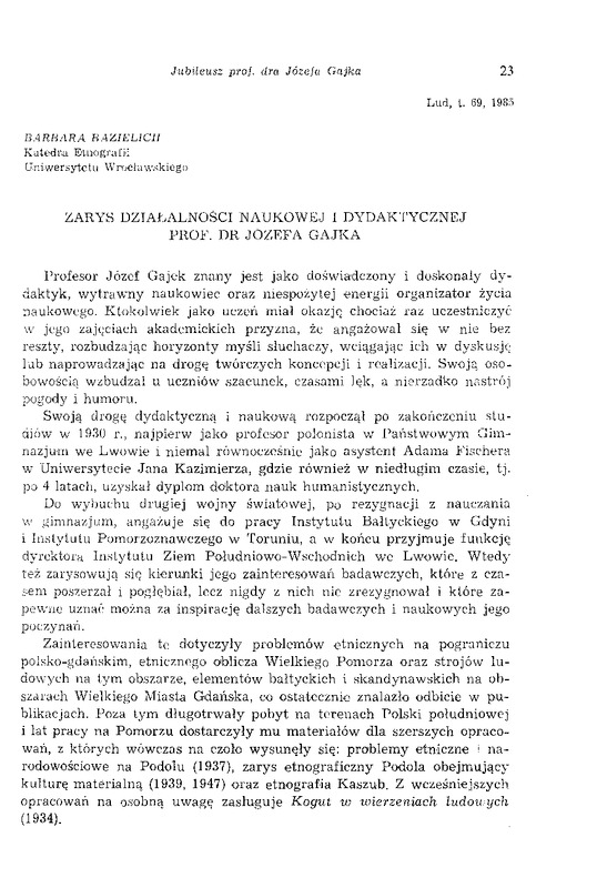 Zarys działalności naukowej i dydaktycznej prof.dra Józefa Gajka/ LUD 1985 t.69