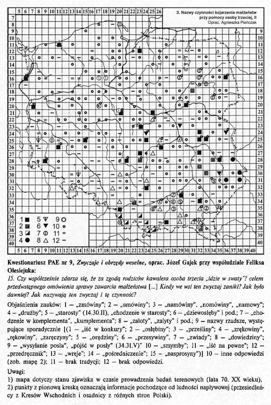 Komentarze do Polskiego Atlasu Etnograficznego t.8:Zwyczaje i obrzedy weselne cz.I: Od zalotów do ślubu cywilnego, red nauk. Agnieszka Pieńczak s.32 ( mapa nr 3 )