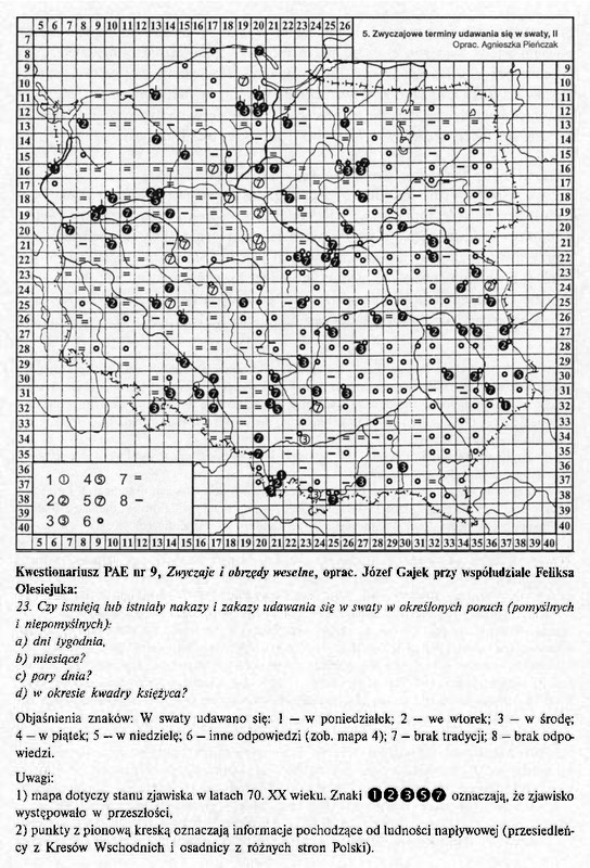 Komentarze do Polskiego Atlasu Etnograficznego t.8:Zwyczaje i obrzedy weselne cz.I: Od zalotów do ślubu cywilnego, red nauk. Agnieszka Pieńczak s.37 ( mapa nr 5)