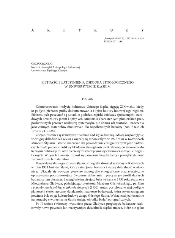 Piętnaście lat ośrodka etnologicznego na Uniwersytecie Śląskim/ ETNOGRAFIA POLSKA 2011 t.55