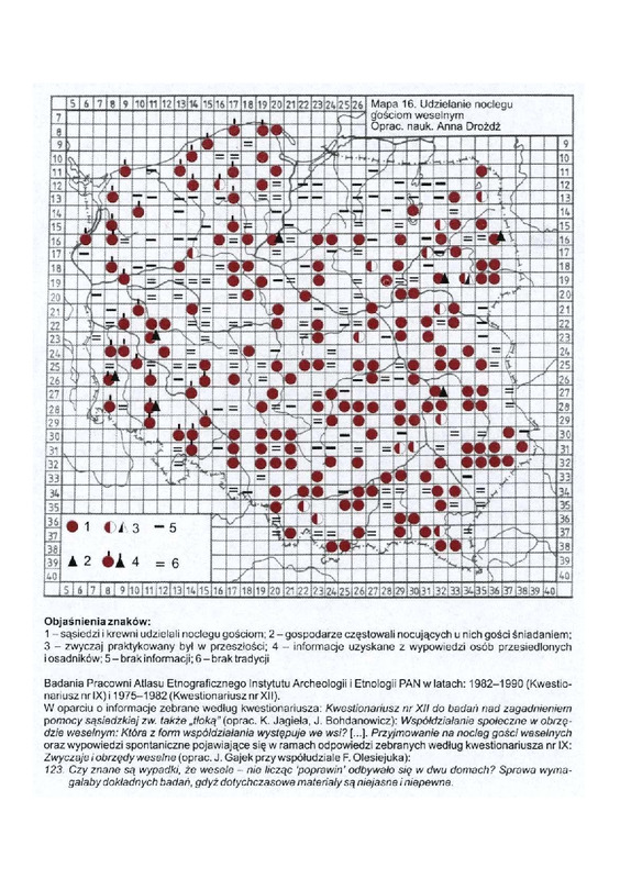Komentarze do Polskiego Atlasu Etnograficznego t.8. Anna Drożdż: Zwyczaje i obrzedy weselne cz.III: Współdziałanie społeczności wiejskiej podczas obrzędu weselnego (druga połowa XIX wieku i XX wiek) ; mapa nr 16