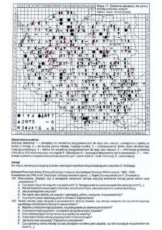 Komentarze do Polskiego Atlasu Etnograficznego t.8. Anna Drożdż: Zwyczaje i obrzedy weselne cz.3: Współdziałanie społeczności wiejskiej podczas obrzędu weselnego (druga połowa XIX wieku i XX wiek) ; mapa nr 17