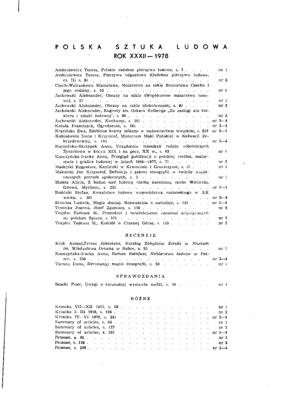 Spis treści t. 32 1978; Contents / Polska Sztuka Ludowa - Konteksty 1979 t.33 z.1