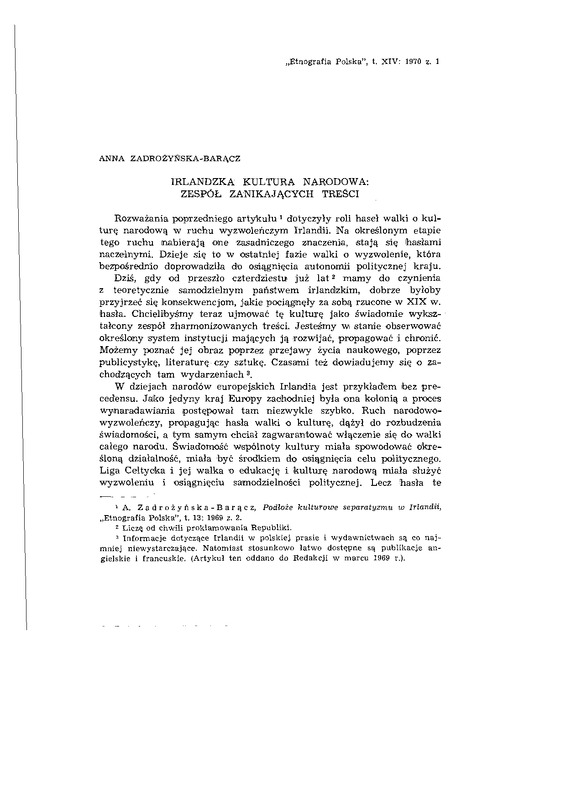 Irlandzka kultura narodowa: zespół zanikających treści / ETNOGRAFIA POLSKA 1970 t.14 z.1