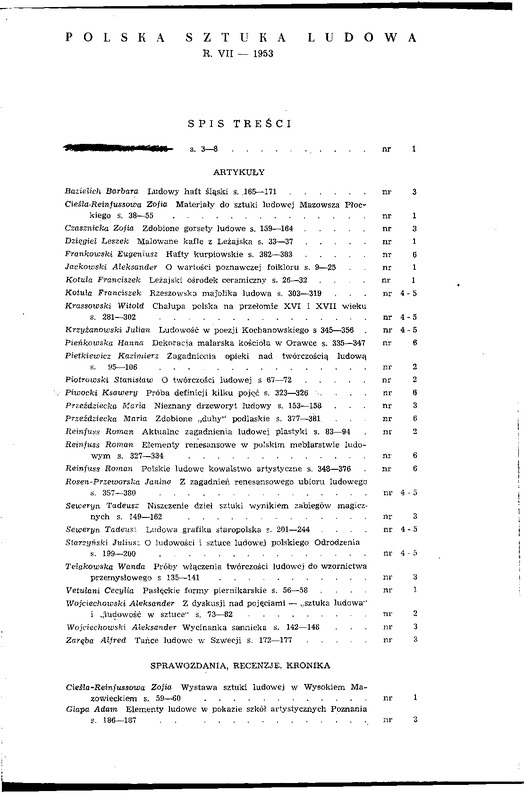 Spis treści tomu VII r.1953 / Polska Sztuka Ludowa - Konteksty 1953 t.7 z.6