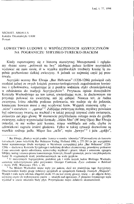 Łowiectwo ludowe u współczesnych Asyryjczyków na pograniczu syryjsko-turecko-irackim / LUD 1994 t.77