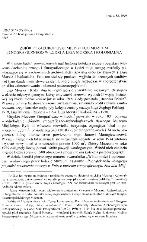 Zbiór pozaeuropejski Miejskiego Muzeum Etnograficznego w Łodzi a Liga Morska i Kolonialna / LUD 1999 t.83