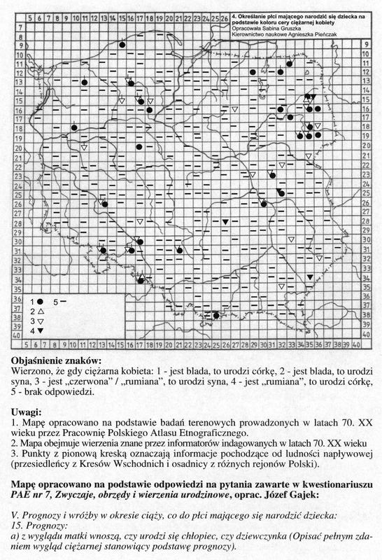 Określanie płci mającego narodzić się dziecka na podstawie koloru cery ciężarnej kobiety/ Komentarze do Polskiego Atlasu Etnograficznego (mapy)