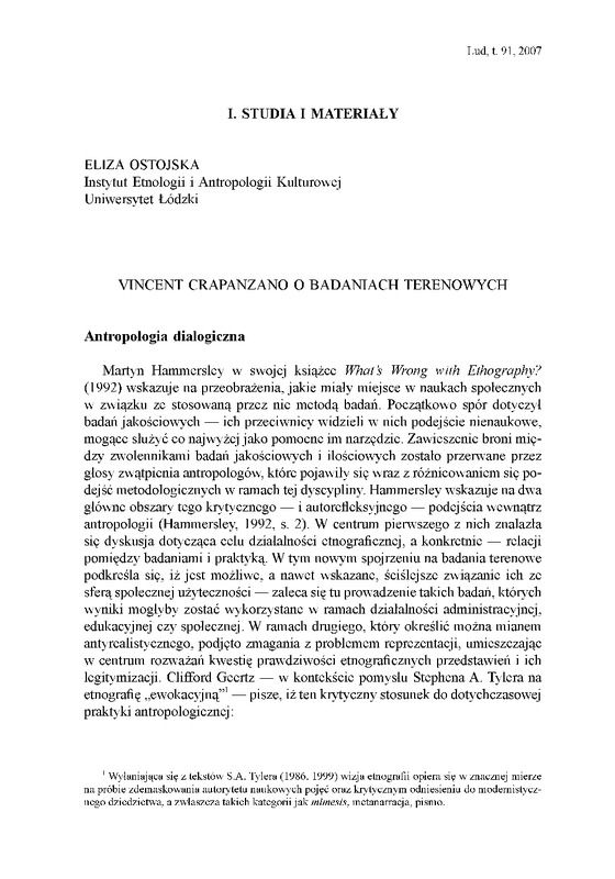 - Vincent Crapanzano o badaniach terenowych / LUD 2007 t.91