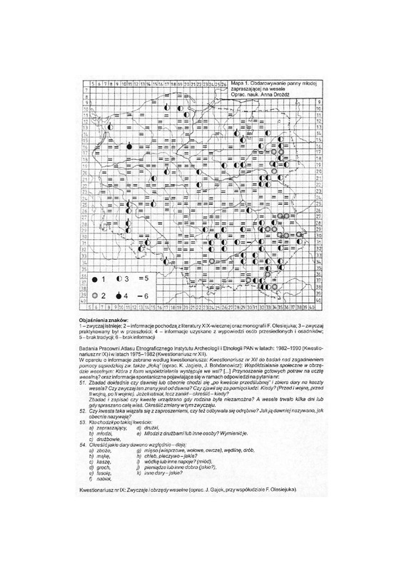 Komentarze do Polskiego Atlasu Etnograficznego t.8. Anna Drożdż: Zwyczaje i obrzedy weselne cz.3: Współdziałanie społeczności wiejskiej podczas obrzędu weselnego (druga połowa XIX wieku i XX wiek) s.357 (mapa nr 1 )