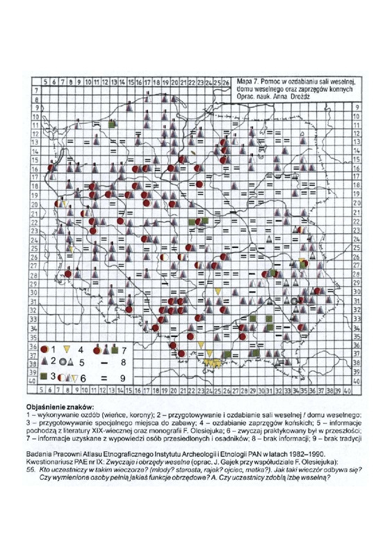 Komentarze do Polskiego Atlasu Etnograficznego t.8. Anna Drożdż: Zwyczaje i obrzedy weselne cz.3: Współdziałanie społeczności wiejskiej podczas obrzędu weselnego (druga połowa XIX wieku i XX wiek) ; (mapa nr 7 )