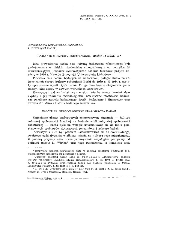 - Badanie kultury robotniczej dużego miasta / ETNOGRAFIA POLSKA 1985 t.29 z.1