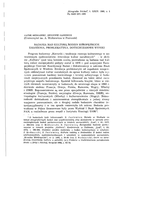 Badania nad kulturą rodzin europejskich. Założenia, problematyka, dotychczasowe wyniki / ETNOGRAFIA POLSKA 1985 t.29 z.1