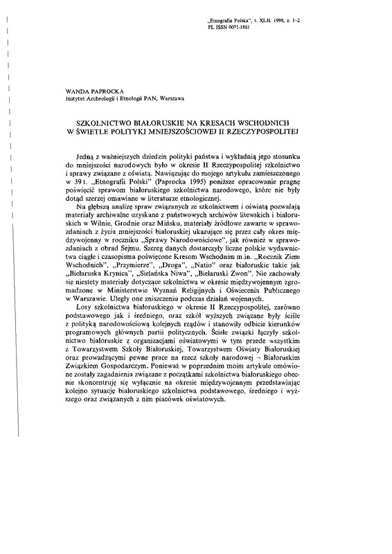 Szkolnictwo białoruskie na Kresach Wschodnich w świetle polityki mniejszościowej II Rzeczypospolitej / ETNOGRAFIA POLSKA 1998 t.42