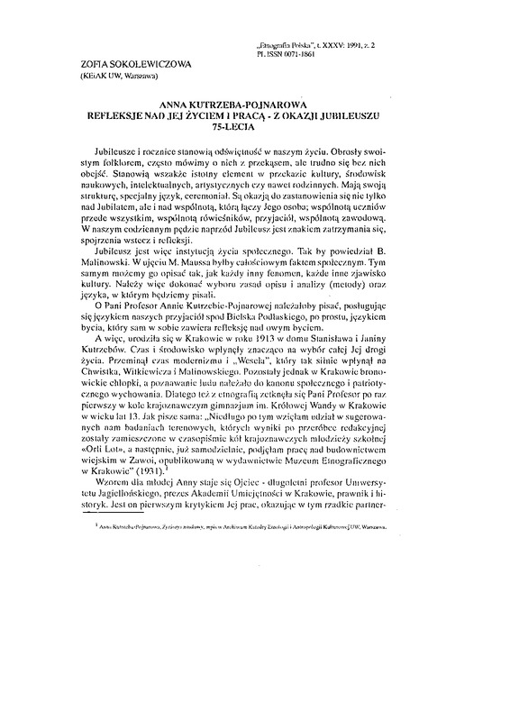 Anna Kutrzeba-Pojnarowa. Refleksje nad jej życiem i pracą - z okazji jubileuszu 75 lecia / ETNOGRAFIA POLSKA 1991 t.35 z.2