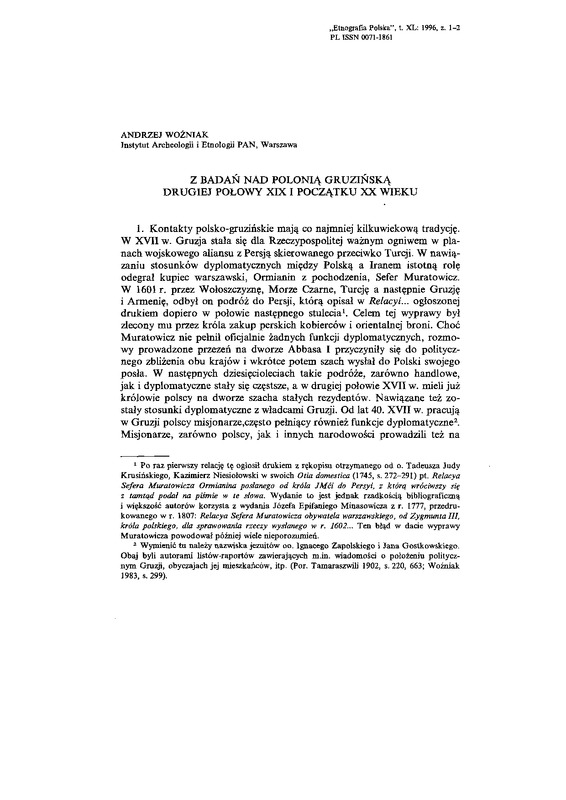 Z badań nad Polonią gruzińską drugiej połowy XIX i początku XX wieku / ETNOGRAFIA POLSKA 1996 t.40