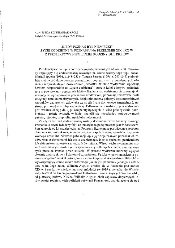 Kiedy Poznań był niemiecki. Życie codzienne w Poznaniu na przełomie XIX i XX w. z perspektywy niemieckiej rodziny Dittrichów / ETNOGRAFIA POLSKA 2003 t.47
