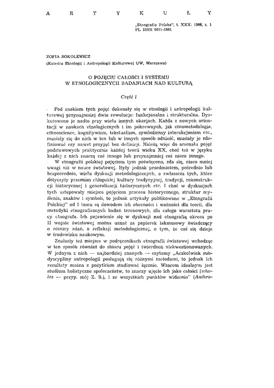 O pojęciu całości i systemu w etnologicznych badaniach nad kulturą / ETNOGRAFIA POLSKA 1986 t.30 z.1