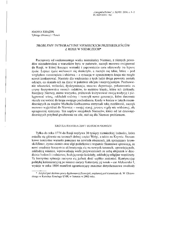 Problemy integracyjne niemieckich przesiedleńców z Rosji w Niemczech / ETNOGRAFIA POLSKA 2004 t.48