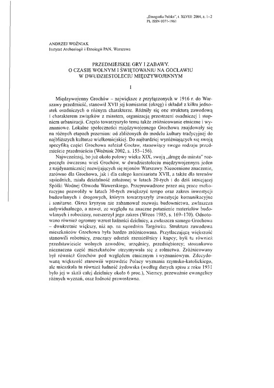 Przedmiejskie gry i zabawy. O czasie wolnym i świętowaniu na Gocławiu w dwudziestoleciu międzywojennym / ETNOGRAFIA POLSKA 2004 t.48