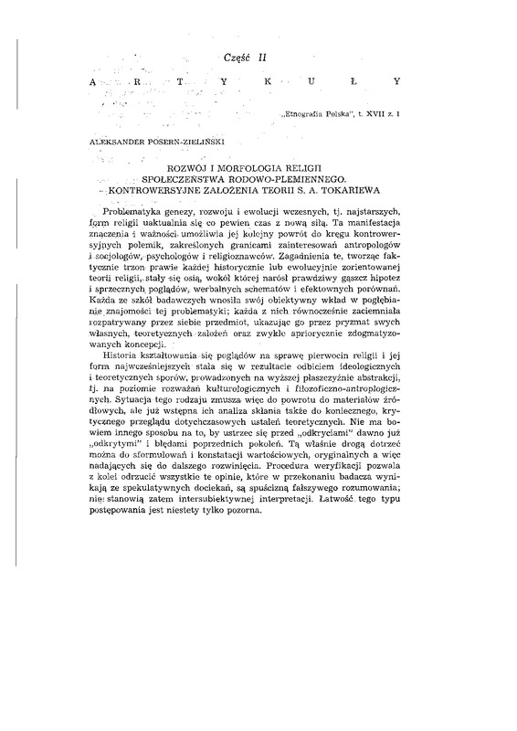 Rozwój i morfologia religii społeczeństwa rodowo-plemiennego. Kontrowersyjne założenia teorii S. A. Tokariewa / ETNOGRAFIA POLSKA 1973 t.17 z.1