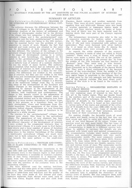 Summary of articles/ Polska Sztuka Ludowa - Konteksty 1967 t.21 z.3