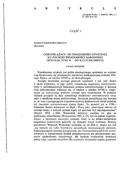 Górnoślązacy. Od świadomości etnicznej ku polskiej świadomości narodowej (schyłek XVIII w. - do Kulturkampfu) / ETNOGRAFIA POLSKA 1993 t.37 z.1