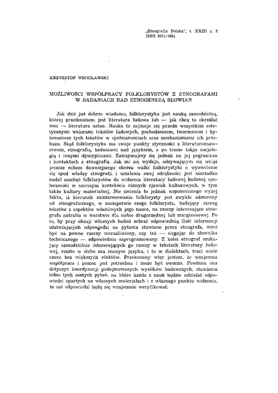 Możliwości współpracy folklorystów z etnografami w badaniach nad etnogenezą Słowian / ETNOGRAFIA POLSKA 1979 t.23 z.2