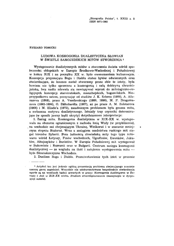 Ludowa kosmogonia dualistyczna Słowian w świetle samojedzkich mitów stworzenia / ETNOGRAFIA POLSKA 1979 t.23 z.2