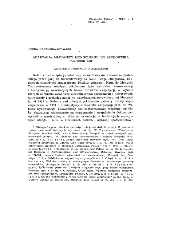 Adaptacja młodzieży mongolskiej do środowiska pasterskiego / ETNOGRAFIA POLSKA 1979 t.23 z.2