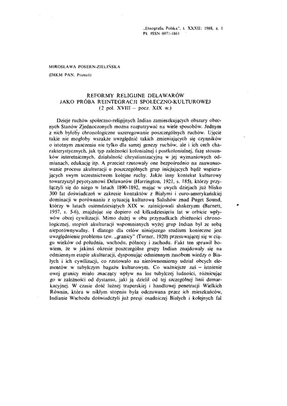 Reformy religijne Delawarów jako próba reintegracji społeczno-kulturowej (2 poł. XVIII - pocz. XIX w.) / ETNOGRAFIA POLSKA 1988 t.32 z.1