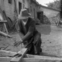 fotografia przedstawia mężczyznę (informatora), który naprawia wóz drewniany (w głębi zagroda).W tle widoczna przechodząca kobieta. Uwaga:- fotografia powstała w trakcie badań etnologicznych po 1 roku studiów Z. Kłodnickiego (praktyka terenowa pod kierunkiem Adolfa Nasza)