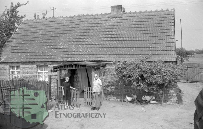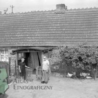 fotografia przedstawia budynek mieszkalny z gankiem, przed którym stoją kobieta i mężczyzna (informatorzy)