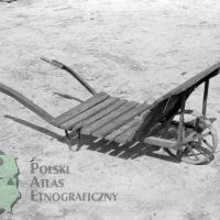 fotografia przedstawia drewniane taczki platformowe z żelaznym kółkiem