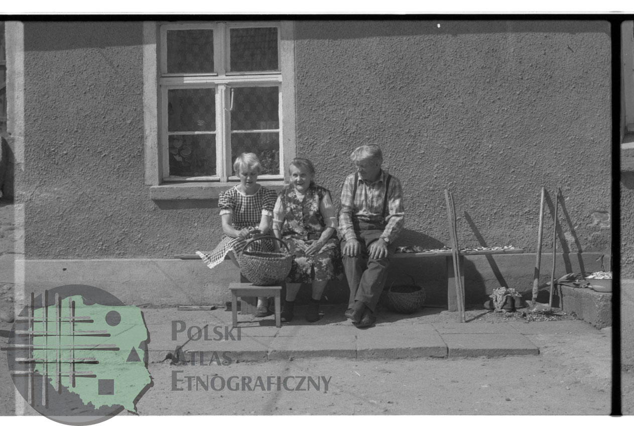 fotografia przedstawia dwie kobiety i mężczyznę siedzących na ławce przed domem; przed nimi na stołku stoi kosz półkolisty z grzybami