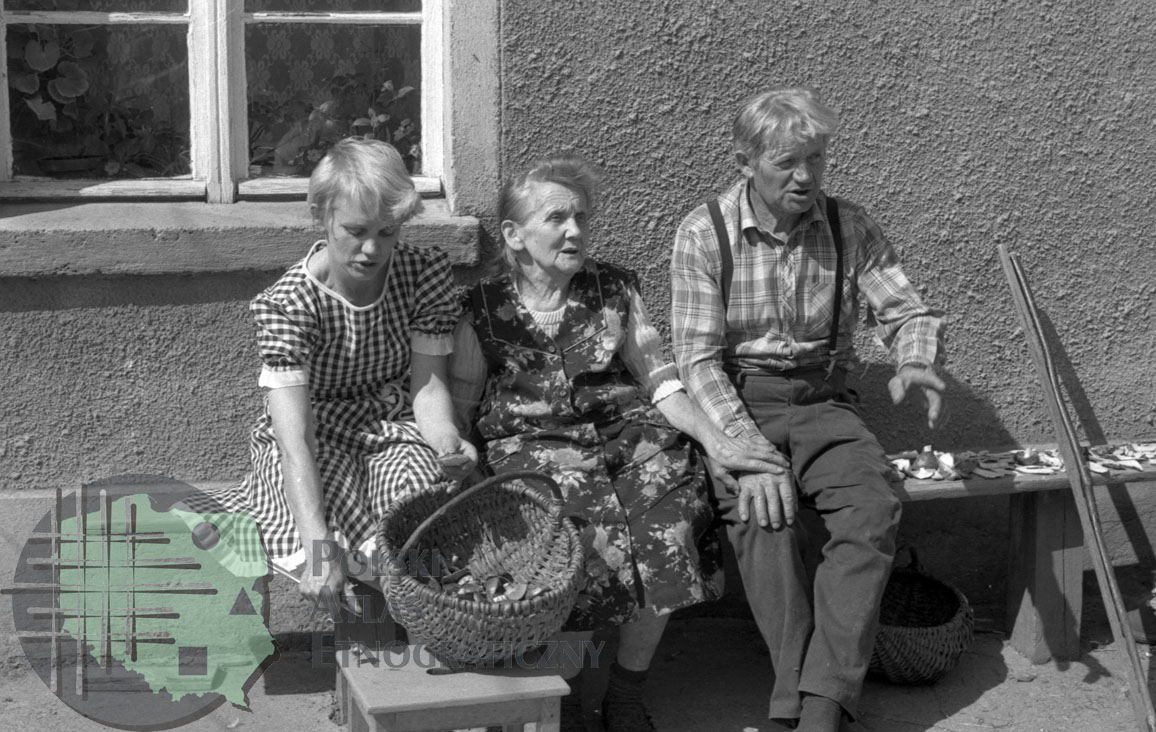 fotografia przedstawia dwie kobiety i mężczyznę siedzących na ławce przed domem; przed nimi na stołku stoi kosz półkolisty z grzybami