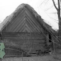 fotografia przedstawia ścianę szczytową budynku gospodarczego o konstrukcji węgłowej. Uwaga:- zdjęcie powstało w trakcie miesięcznych badań archeologiczno-etnologicznych, w których uczestniczyli również studenci etnologii (w tym Zygmunt Kłodnicki) prowadzeni pod kierunkiem naukowym Adolfa Nasza