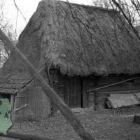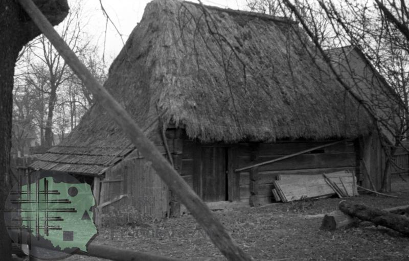 fotografia przedstawia budynek gospodarczy (stodołę) o konstrukcji węgłowej ścian. Uwaga:- zdjęcie powstało w trakcie miesięcznych badań archeologiczno-etnologicznych, w których uczestniczyli również studenci etnologii (w tym Zygmunt Kłodnicki) prowadzeni pod kierunkiem naukowym Adolfa Nasza