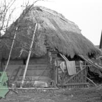 fotografia przedstawia budynek gospodarczy o konstrukcji węgłowej ścian, na zdjęciu widoczny jest także fragment zagrody i ogrodzenie. Uwaga:- zdjęcie powstało w trakcie miesięcznych badań archeologiczno-etnologicznych, w których uczestniczyli również studenci etnologii (w tym Zygmunt Kłodnicki) prowadzeni pod kierunkiem naukowym Adolfa Nasza
