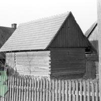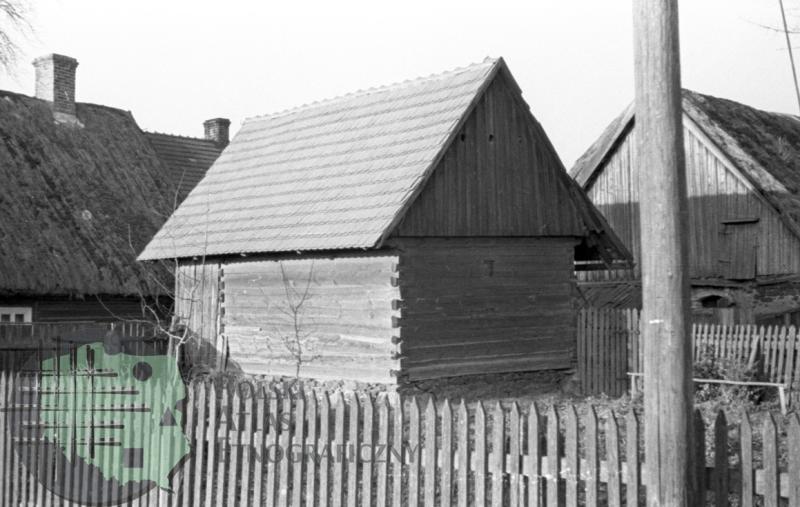 fotografia przedstawia budynek gospodarczy o konstrukcji zrębowej ścian. Uwaga:- zdjęcie powstało w trakcie miesięcznych badań archeologiczno-etnologicznych, w których uczestniczyli również studenci etnologii (w tym Zygmunt Kłodnicki) prowadzeni pod kierunkiem naukowym Adolfa Nasza