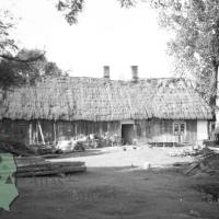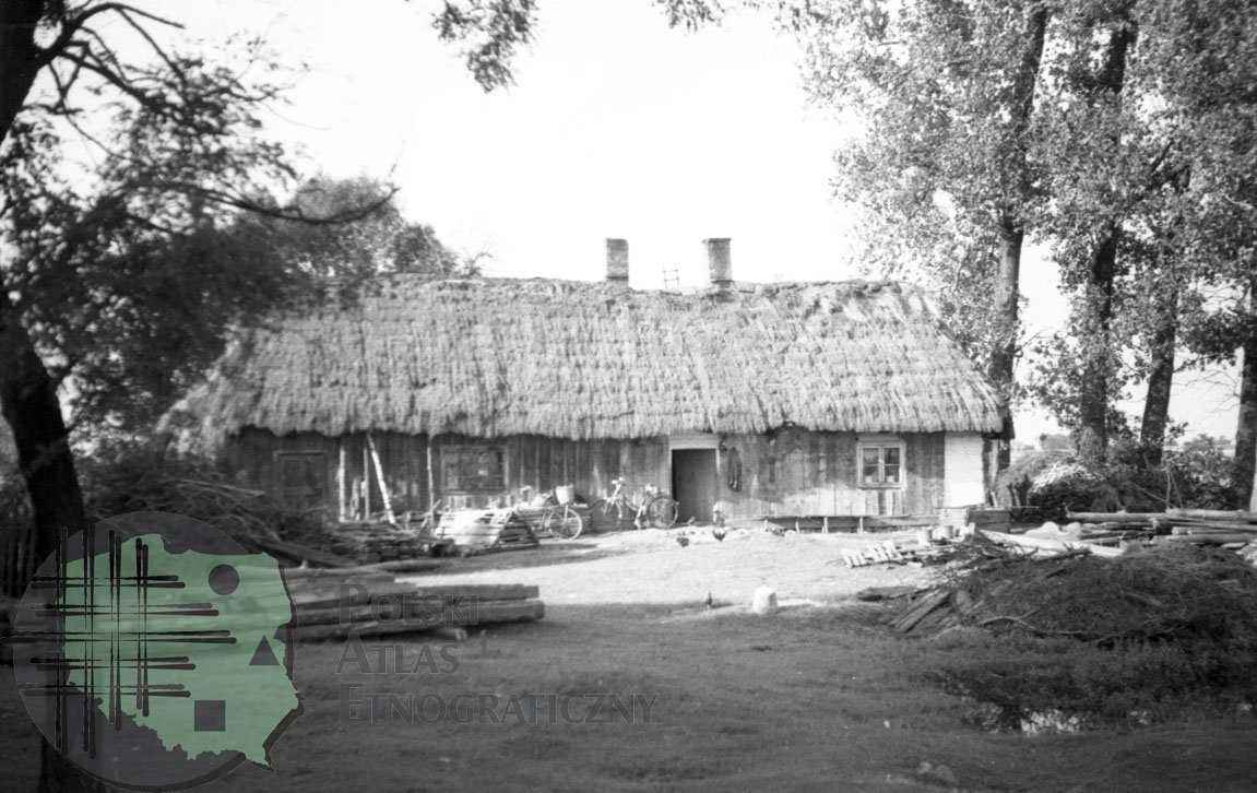 fotografia przedstawia drewniany budynek mieszkalno-gospodarczy, przed nim stoją dwa rowery. Uwaga:- zdjęcie powstało w trakcie miesięcznych badań archeologiczno-etnologicznych, w których uczestniczyli również studenci etnologii (w tym Zygmunt Kłodnicki) prowadzeni pod kierunkiem naukowym Adolfa Nasza